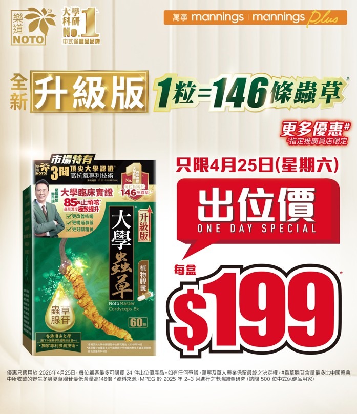 樂道大學蟲草於4月25日(星期六)在萬寧推出限時出位價優惠,只限一天。單盒特價為$199(原價$369),適合關注氣管敏感、鼻敏感及免疫力的港人選購。